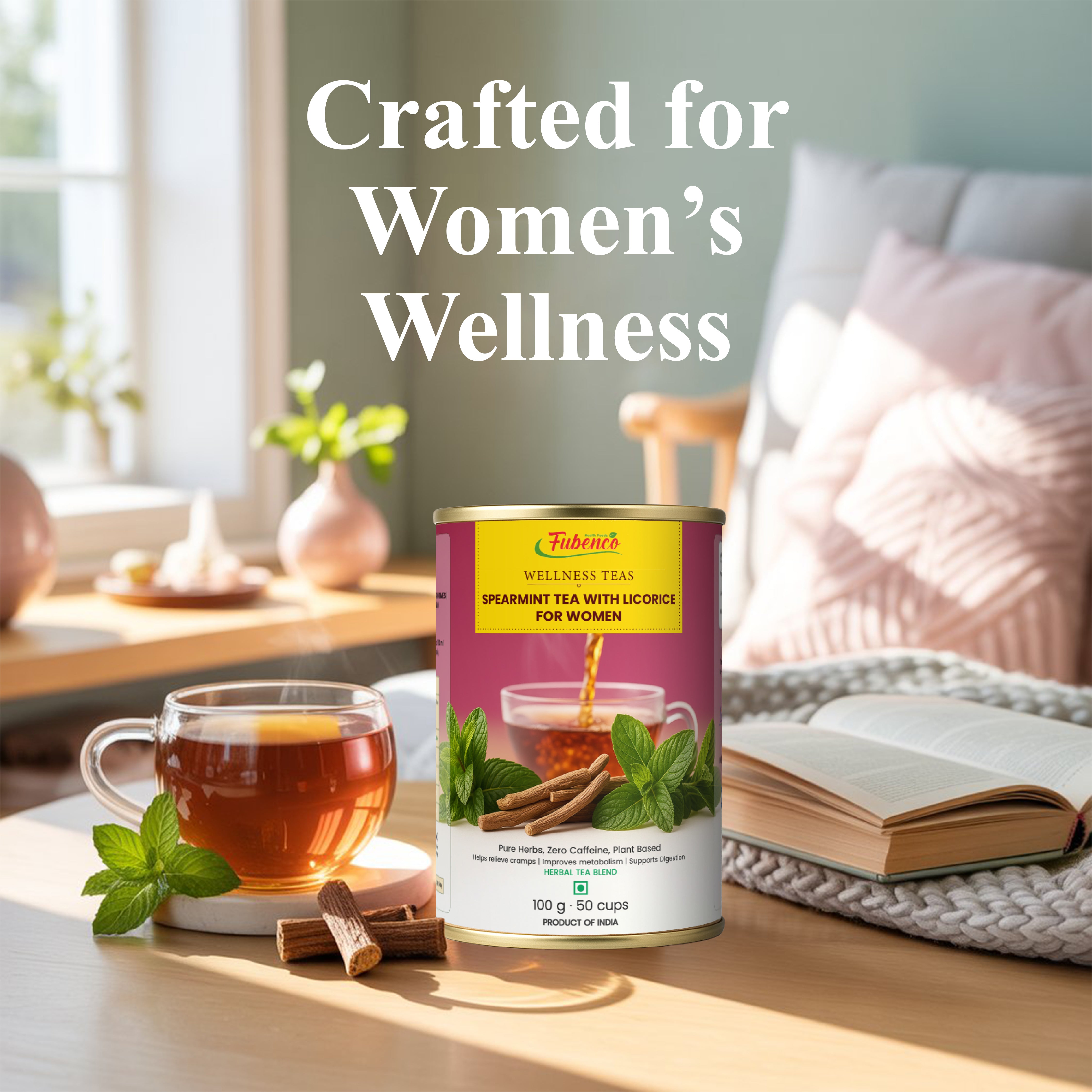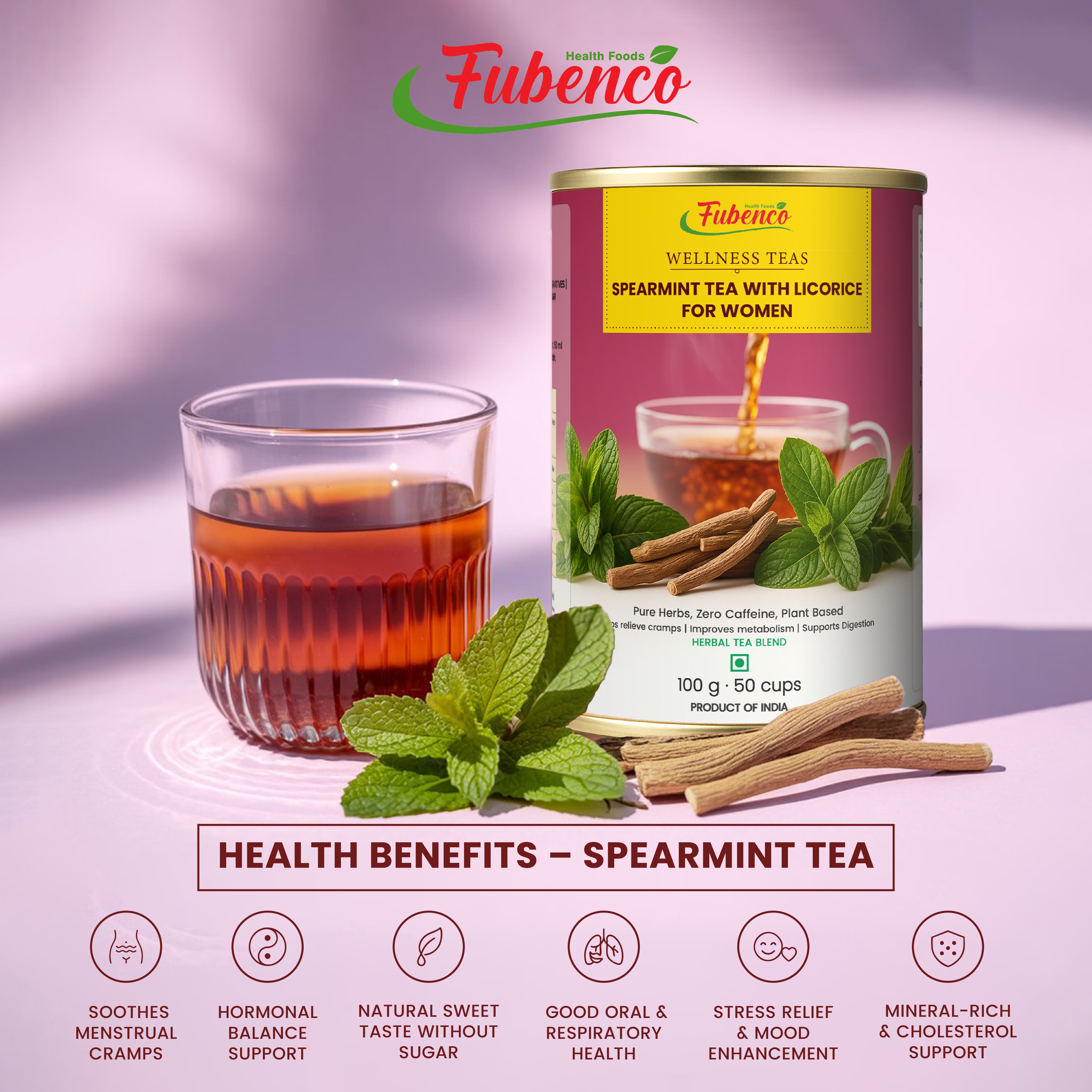 Support your feminine wellness journey with Fubenco Spearmint Licorice Tea, a specially formulated herbal blend designed for women's unique health needs. This caffeine-free, science-backed formula combines the hormonal balancing properties of spearmint with the soothing sweetness of licorice.